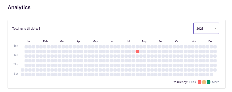 If the selected chaos scenario is recurring or is re-run multiple times, a heat map representing the days of the year showing all the chaos scenario runs for the selected chaos scenario can be observed. On hovering over a point in the heat map, the average resiliency score for that particular day will be shown in the form of a tool-tip.